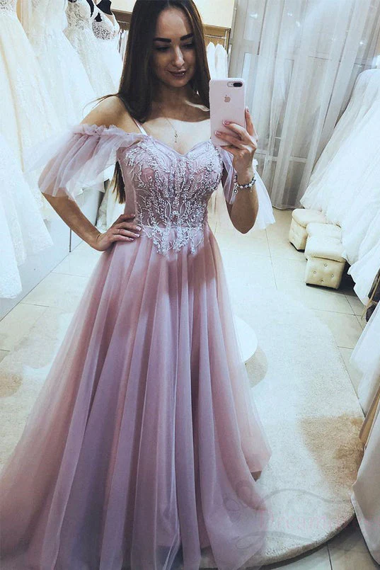 A-Line Lulle Pink Long Prom Dress Lace Appliques Formal Evening Dress OK1229