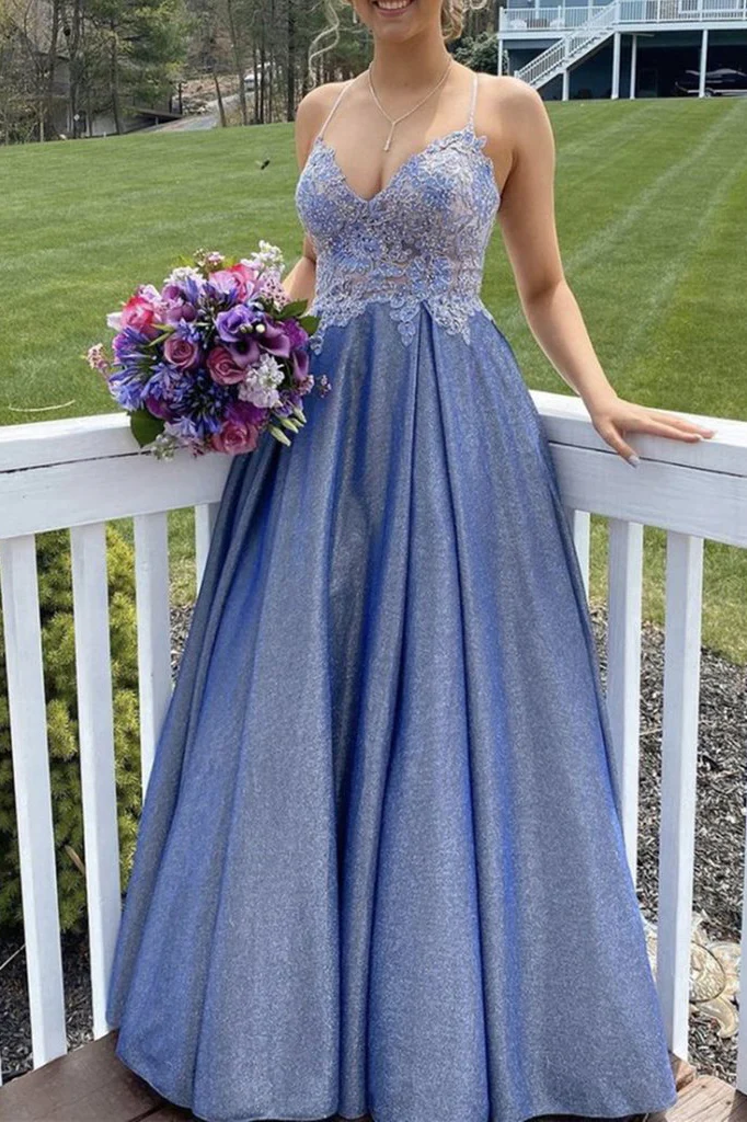 A-line Spaghetti Straps Blue Lace Top Prom Dress OKZ5