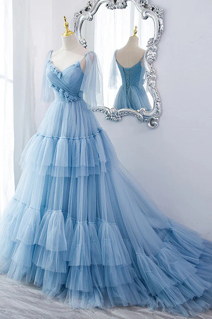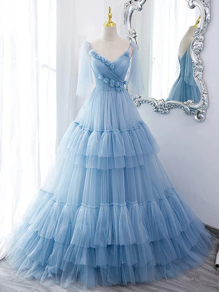 A Line V Neck Blue Long Prom Dress with Sweep Train, Formal Evening Dresses OK2004