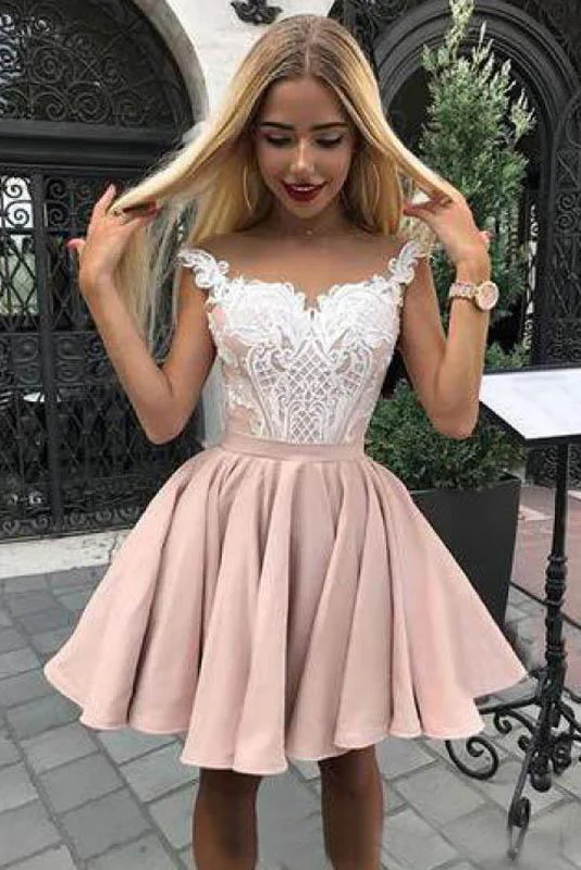 • Cap Sleeves Dusty Pink Cheap Homecoming Dress A-line Short Prom Dress With White Lace OKY60