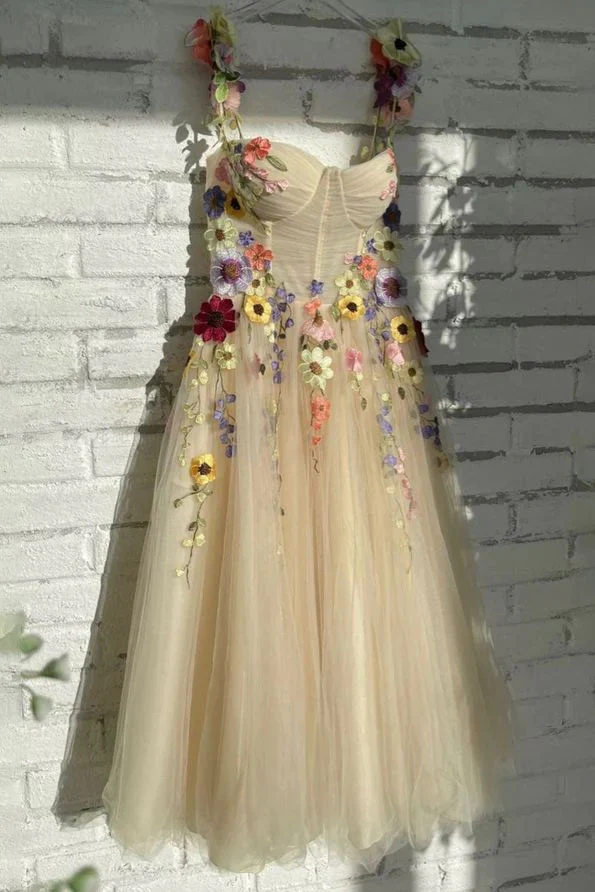 Colorful Pattern Appliques Formal Party Dresses 3D Flowers Straps Prom Dress OK1975