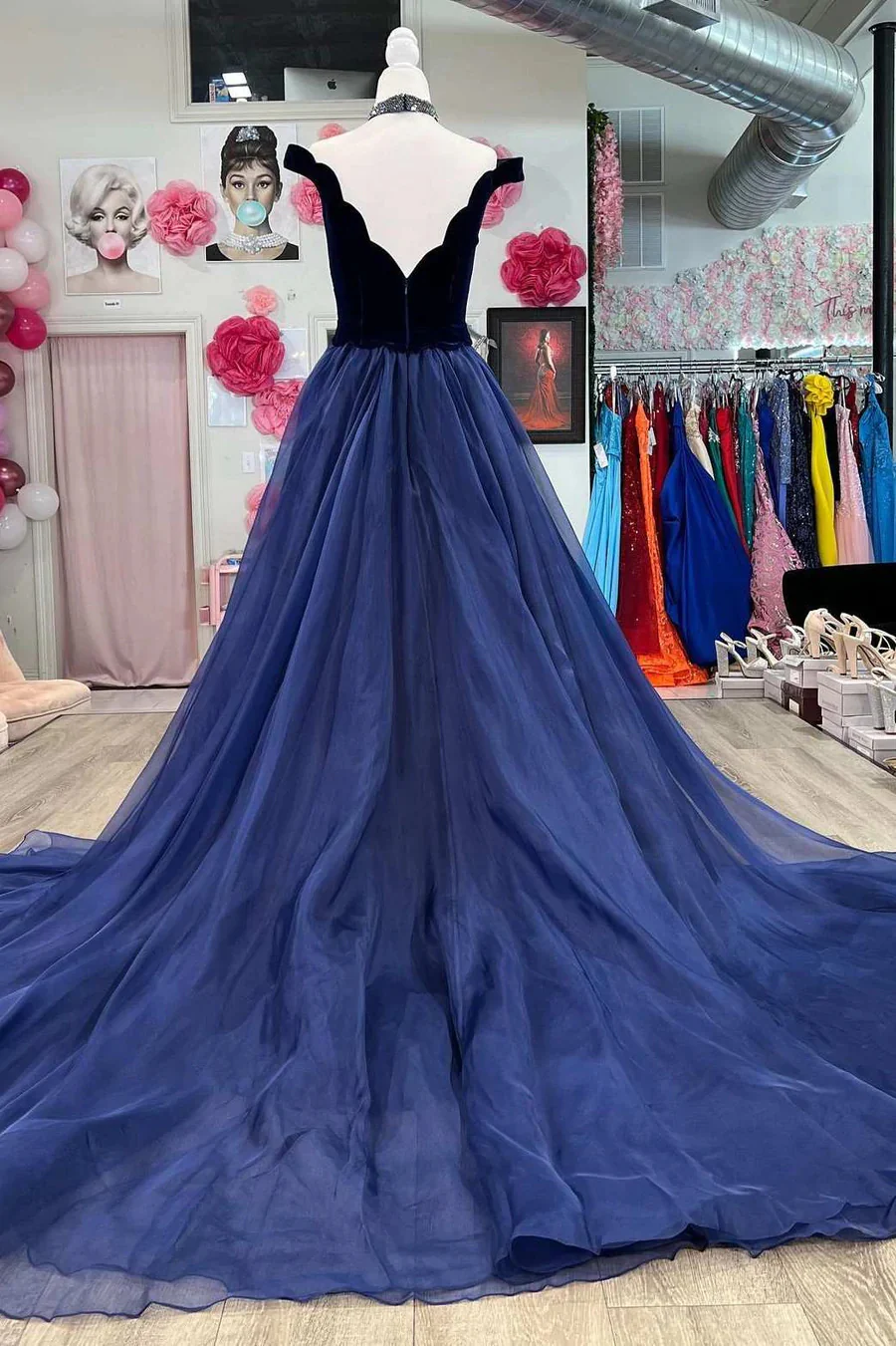 Elegant Navy Velvet Off-the-Shoulder Mermaid Long Prom Gown with Attached Train OK1895
