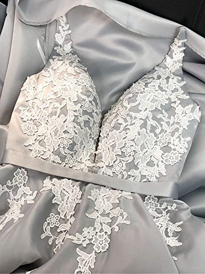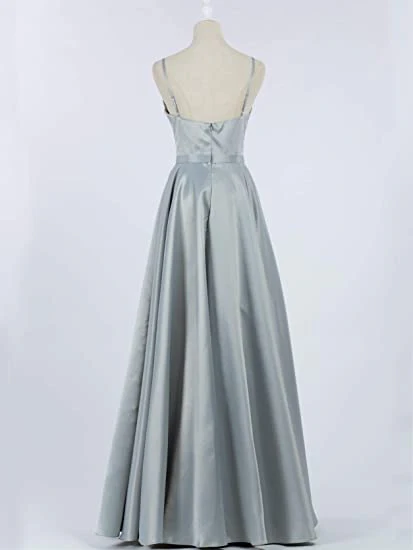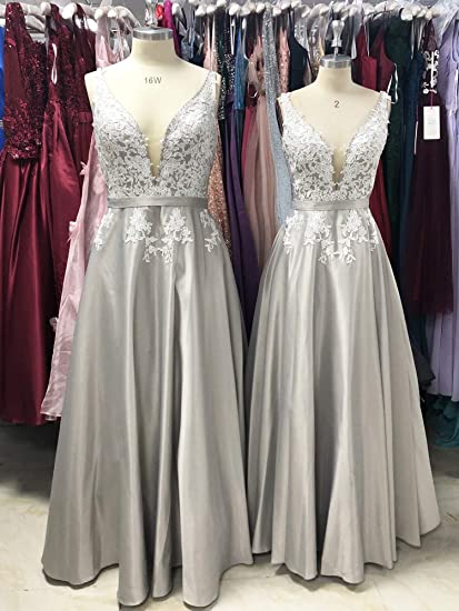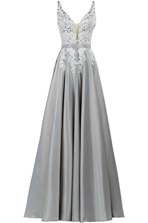 Grey A-line Satin Long Prom Dress for Women Evening Dress With Lace Appliqued OKY55