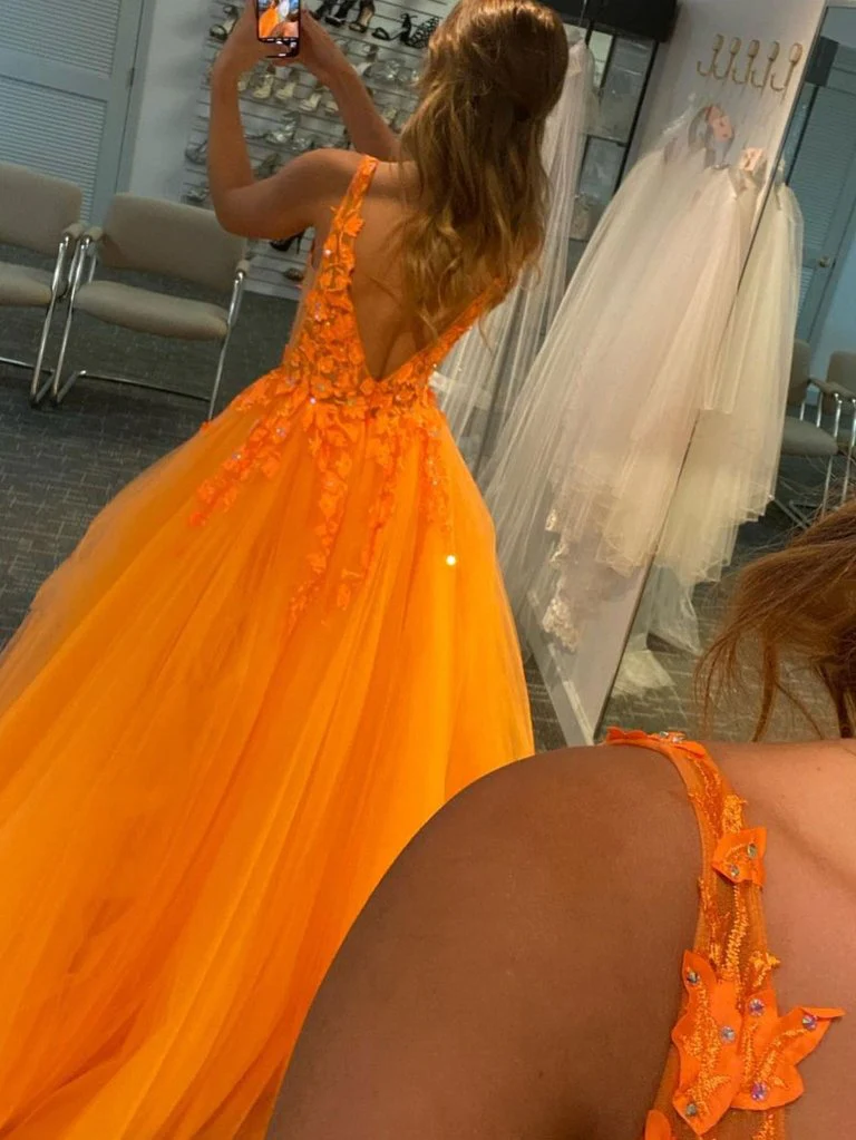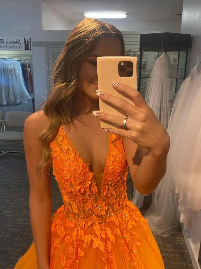 • Orange A Line V Neck Tulle Lace Appliques Long Prom Dress Cheap Evening Dress OK1131