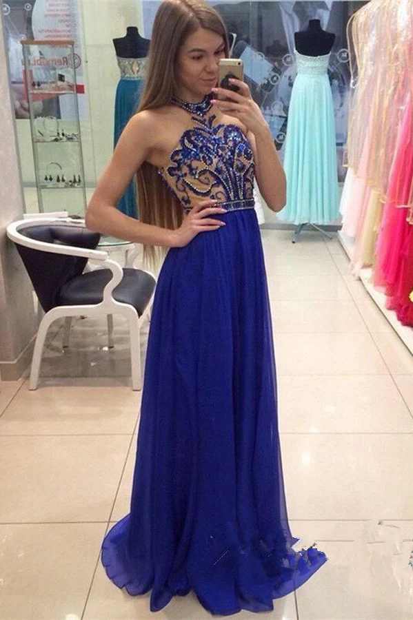 Royal Blue Long Beaded Halter Handmade Chiffon Prom Dress K634