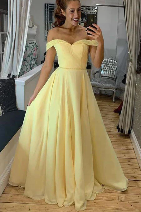 • Off Shoulder Long Yellow Prom Dress with Beading Fashion Dance Dress OKZ24